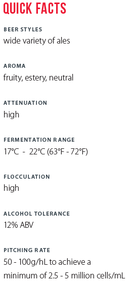 Saccharomyces cerevisiae strain selected from the Lallemand Yeast Culture Collection for the production of traditional Ale styles. This robust strain has been selected for its neutral characteristics and can be used as a direct pitch for a wide variety of ale style beers.