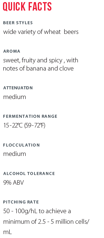 A blend of 2 Saccharomyces cerevisiae strains selected from the Lallemand Yeast Culture Collection for the production of traditional Wheat Beer styles. This blend expresses flavors and aromas that are sweet and fruity, especially those of banana and clove.